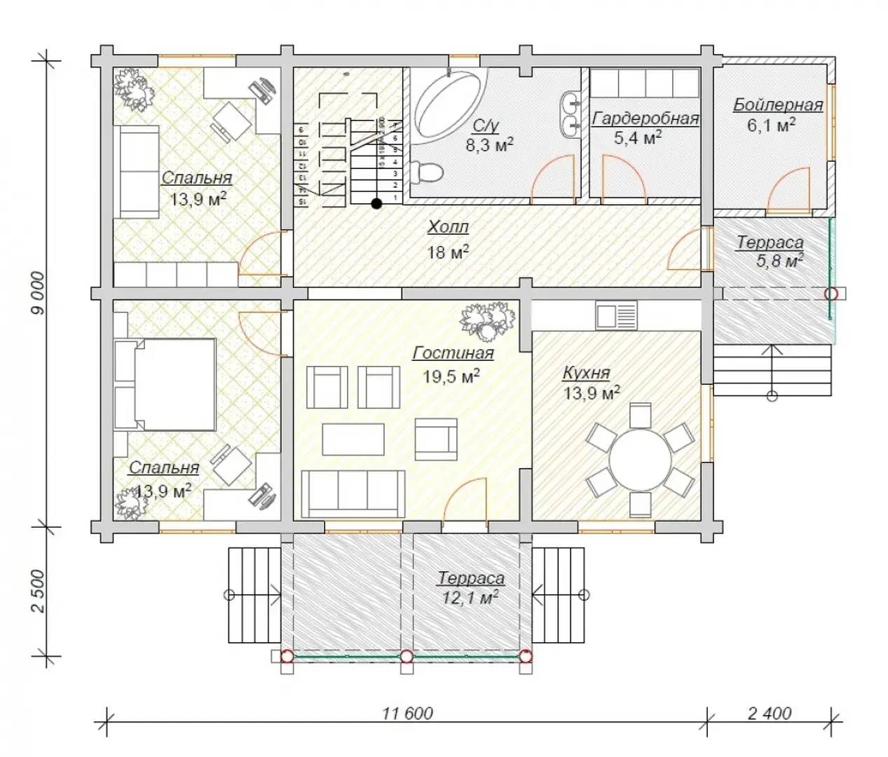 14х12 218 м.кв. Первый этап фундамент, сруб, крыша.
