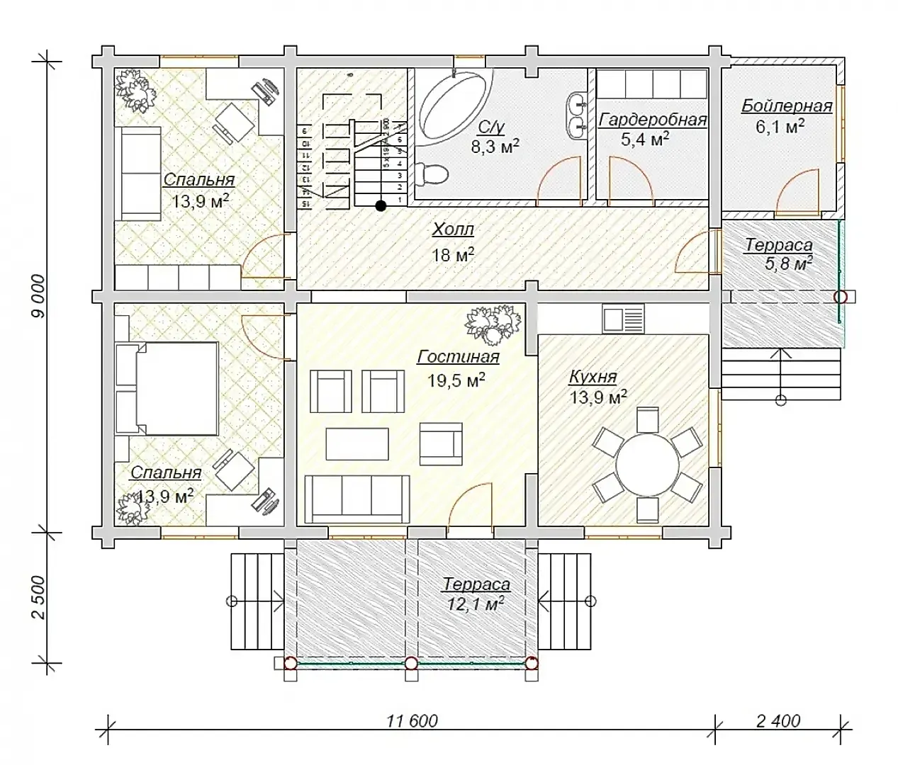 14х12 218 м.кв. Первый этап фундамент, сруб, крыша.