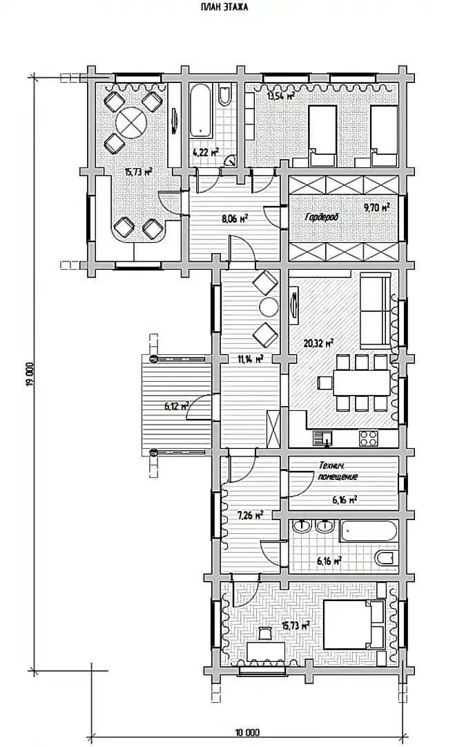 10х19 123 м.кв. Первый этап фундамент, сруб, крыша.